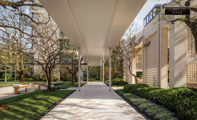 行走在项目实景展示区,葡萄牙米黄石材的温润立面、手工艺术陶瓷砖的细腻肌理、以及水景与光影交织的庭院空间、功能齐备的高端会所……共同构成可触可感的真实生活场景。
